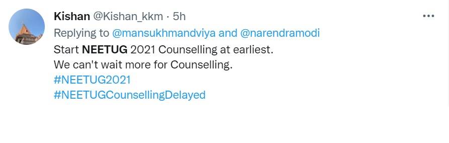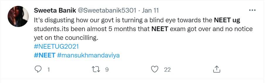 "It's disgusting how our govt is turning a blind eye towards the NEET ug students.its been almost 5 months that NEET exam got over and no notice yet on the councilling. #NEETUG2021 #NEET #mansukhmandaviya"