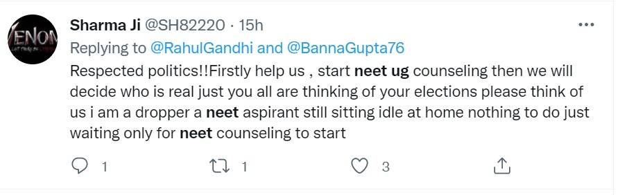 "Respected politics!!Firstly help us , start neet ug counseling then we will decide who is real just you all are thinking of your elections please think of us i am a dropper a neet aspirant still sitting idle at home nothing to do just waiting only for neet counseling to start"