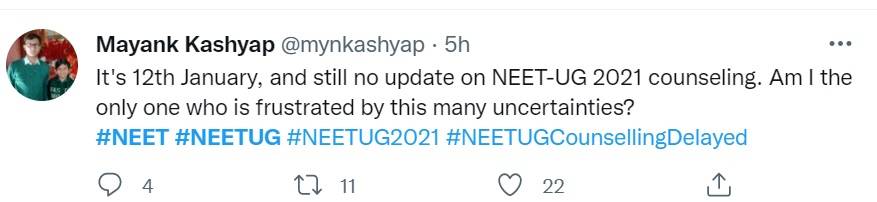 "It's 12th January, and still no update on NEET-UG 2021 counseling. Am I the only one who is frustrated by this many uncertainties? #NEET #NEETUG #NEETUG2021 #NEETUGCounsellingDelayed"