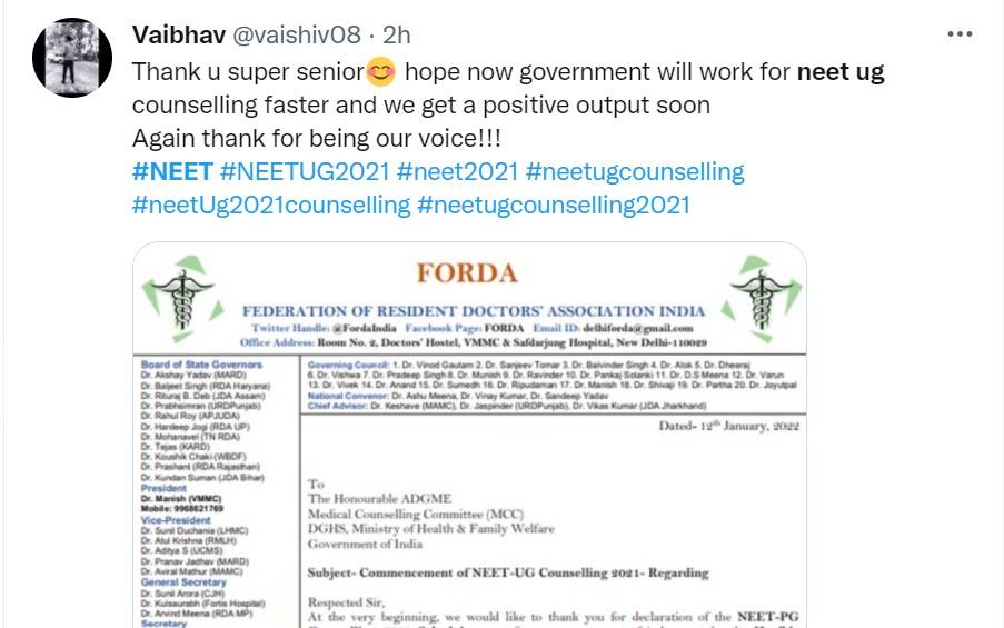 The Federation of Resident Doctors Association (FORDA) has written to Medical Counselling Committee (MCC) and requested the Committee to start the counselling soon. Following are the tweets of candidates demanding NEET UG Counselling 2021 to start at the earliest: