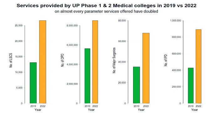 Uttar Pradesh Medical Education Secretary Alok Kumar has said that the health infrastructure of the districts has improved due to 14 newly established medical colleges. When compared with the pre-covid period, there has been a 2X increase across parameters which resulted in better health services in 14 districts.