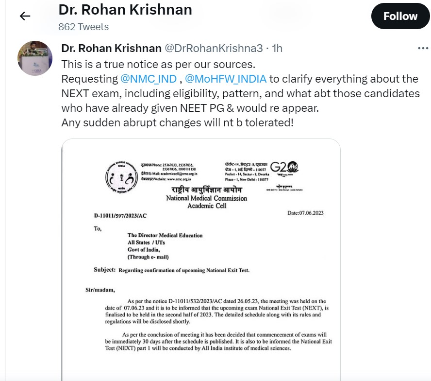 “This is a true notice as per our sources. Requesting NMC_IND, MoHFW_INDIA to clarify everything about the NEXT exam, including eligibility, pattern, and what abt those candidates who have already given NEET PG & would re appear. Any sudden abrupt changes will nt b tolerated!,” Krishnan tweeted.