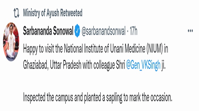 Union Minister of Ayush and Ports Shipping and Waterways Sarbananda Sonowal inspected the newly constructed campus of the National Institute of Unani Medicine (NIUM) at Ghaziabad, Uttar Pradesh.
