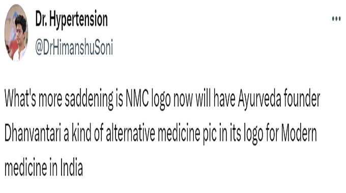 "What's more saddening is NMC logo now will have Ayurveda founder Dhanvantari a kind of alternative medicine pic in its logo for Modern medicine in India," says one of the tweet.