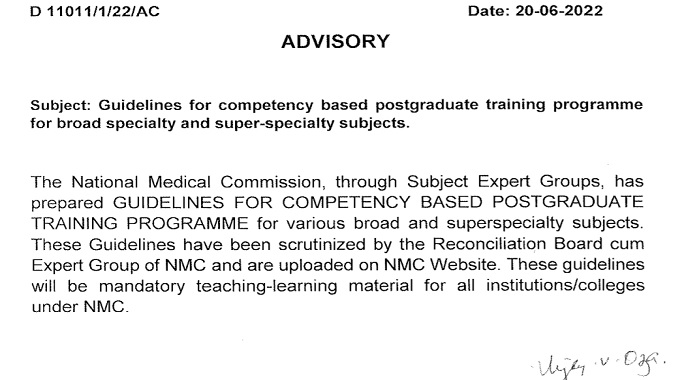 NMC has directed all medical colleges and institutions to follow the guidelines for the Competency Based Postgraduate Training Programme uploaded on its website.