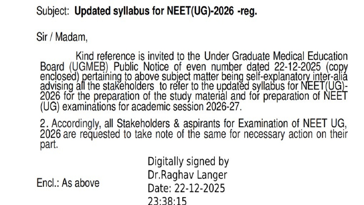 "The stakeholders are advised to refer to the updated syllabus for NEET(UG)-2026 for the preparation of the study material and for preparation of NEET (UG) examinations for academic session 2026-27." The official notification reads.