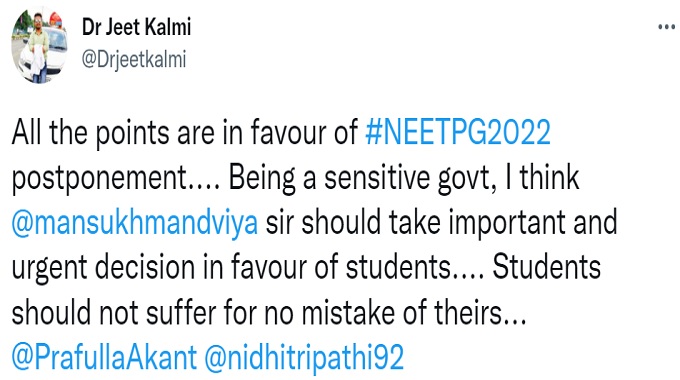 "All the points are in favour of #NEETPG2022 postponement.... Being a sensitive govt, I think @mansukhmandviya sir should take important and urgent decision in favour of students.... Students should not suffer for no mistake of theirs... @PrafullaAkant @nidhitripathi92"