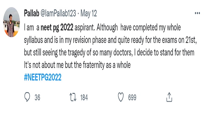 "I am a neet pg 2022 aspirant. Although have completed my whole syllabus and is in my revision phase and quite ready for the exams on 21st, but still seeing the tragedy of so many doctors, I decide to stand for them It's not about me but the fraternity as a whole"