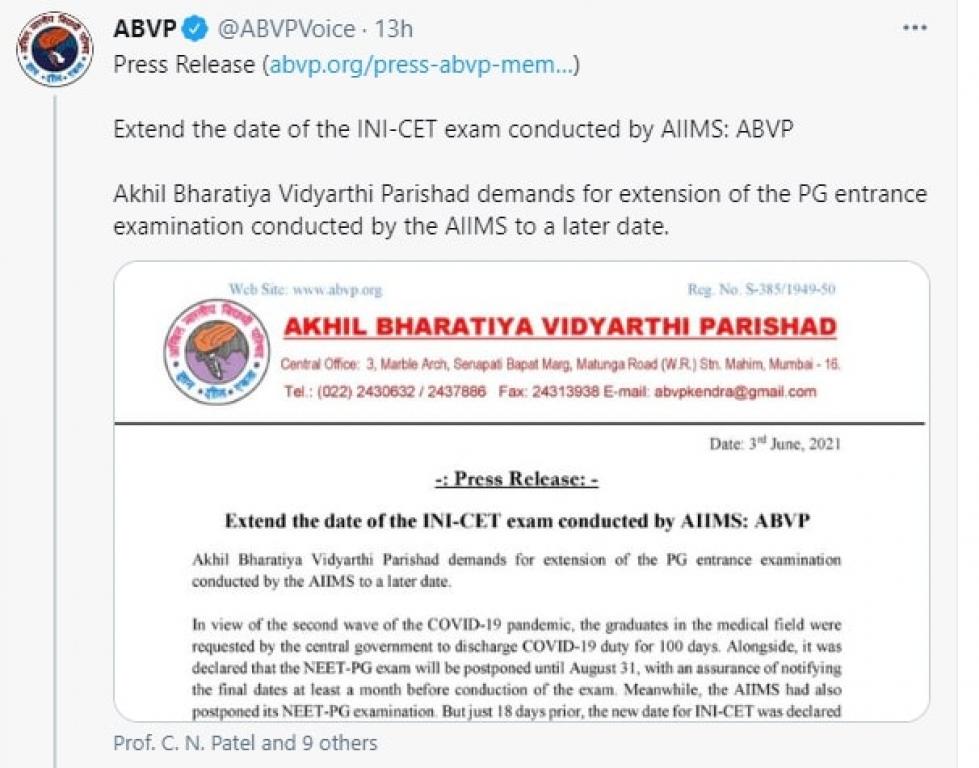 "The AIIMS had postponed its INI-CET examination. But now, only 18 days prior, the new date for INI CET Exam 2021 by AIIMS stands at June 16. This has caused a furore within the student community," Akhil Bharatiya Vidyarthi Parishad (ABVP) said.