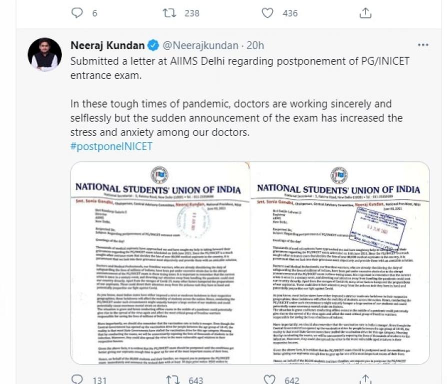 National Students' Union of India (NSUI) has written a letter to AIIMS director and requested him to postpone INI CET 2021 exam. In the letter, Neeraj Kundan, President, NSUI said, "Thousands of medical aspirants have approached me and sought my help in taking forward their grievances regarding the INI CET Exam 2021 schedule on June 16, 2021."
