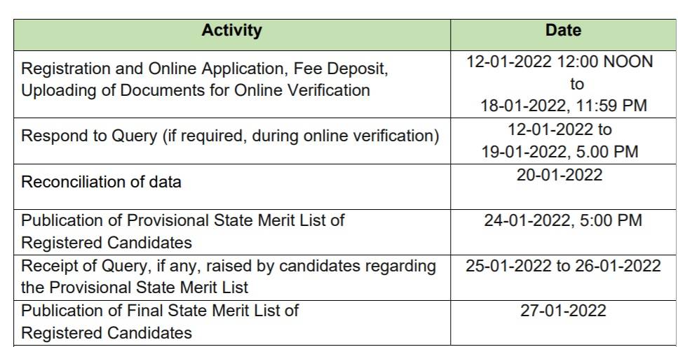 Publication of provisional state merit list of registered candidates will be done on January 24, at 5:00 pm. Receipt of query, if any, raised by candidates regarding the provisional state merit list will be between January 25 to January 26 and publication of the final state merit list of registered candidates will be on January 27.