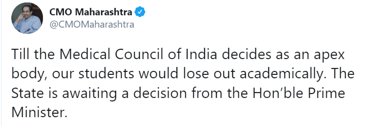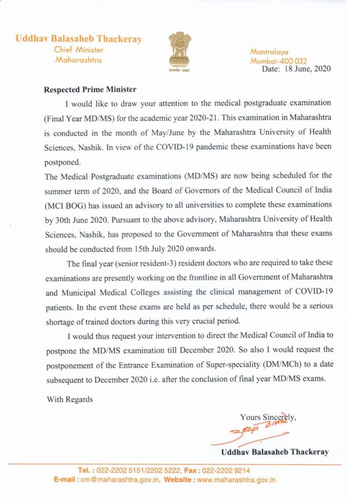 In the letter, Mr Thackarey requested PM to direct the medical council of India to postpone the exams to be conducted by the Maharashtra University of Health Sciences, MUHS, Nashik. These PG Medical exams were to commence from July 15, 2020.