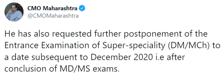 According to the chief minister the state of Maharashtra is worse hit by the novel coronavirus with constantly increasing COVID-19 positive patients. He also informed the Prime Minister that the medical graduates are presently involved in managing the heavy number of patients in the state hospitals and the conduction of the exams would lead to a shortage of trained doctors in the state.