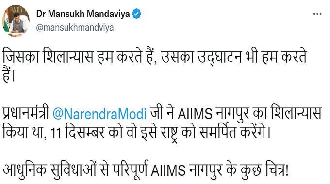 Union health minister Mansukh Mandaviya's tweet reads, "We also inaugurate projects for which we lay the foundation stone, Prime minister @NarendraModi Ji had laid the foundation stone of AIIMS Nagpur, he will dedicate it to the nation on 11th December. Some pictures of AIIMS Nagpur full of modern facilities!"