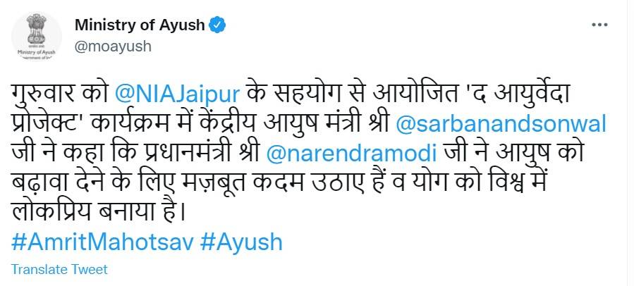 The Ministry of Ayush tweet reads, "On Thursday, during 'The Ayurveda Project' program, Union AYUSH Minister Shri Sarbananda Sonowal ji said that Prime Minister Narendra Modi has taken significant steps for AYUSH and also made yoga more popular in the world."