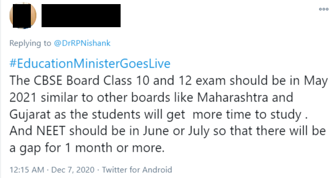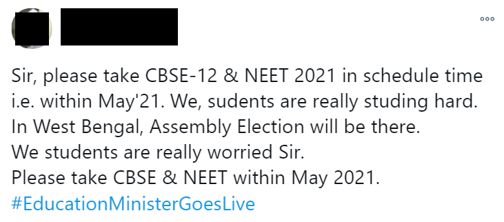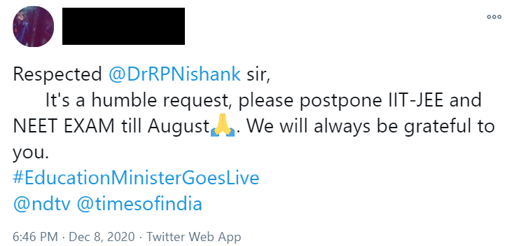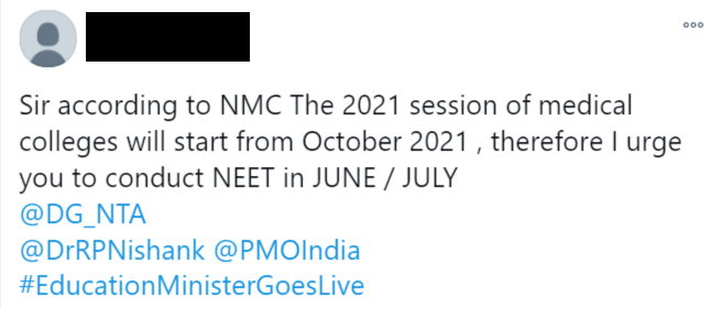 Reports suggest that the students have flooded Twitter with a series of tweets for NEET 2021 exam postponement, syllabus reduction, NEET 2021 Date, etc. Students are using #EducationMinisterGoesLive to share their queries and responses. All those who have not shared their queries yet can post the same on Twitter with the hashtag - #EducationMinisterGoesLive. Though there has been no confirmation from the MoE, there are speculations on a possible announcement for the CBSE Board Exams 2021 as well as JEE, NEET 2021 examinations.