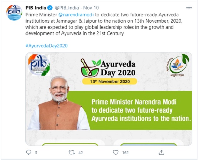 Prime Minister Narendra Modi on the occasion of Ayurveda Day 2020 tomorrow; i.e. November 13, will inaugurate the Institute of Teaching and Research in Ayurveda (ITRA) at Jamnagar and National Institute of Ayurveda (NIA) at Jaipur virtually. It is expected that these institutions will play global leadership roles in the growth and development of Ayurveda.