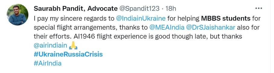 "I pay my sincere regards to @IndiainUkraine for helping MBBS students for special flight arrangements, thanks to @MEAIndia @DrSJaishankar also for their efforts. AI1946 flight experience is good though late, but thanks @airindiain #UkraineRussiaCrisis #AirIndia"