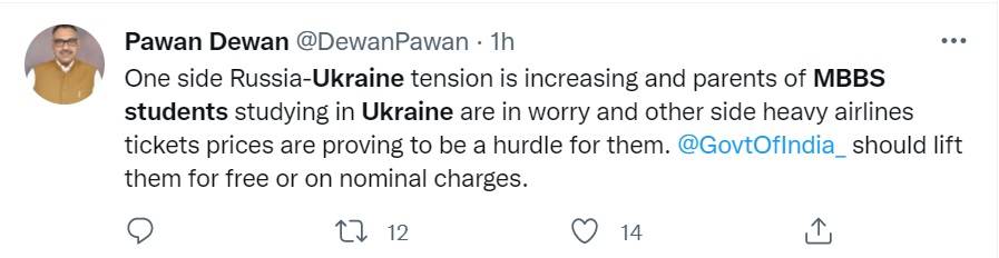 "One side Russia-Ukraine tension is increasing and parents of MBBS students studying in Ukraine are in worry and other side heavy airlines tickets prices are proving to be a hurdle for them. @GovtOfIndia_ should lift them for free or on nominal charges."
