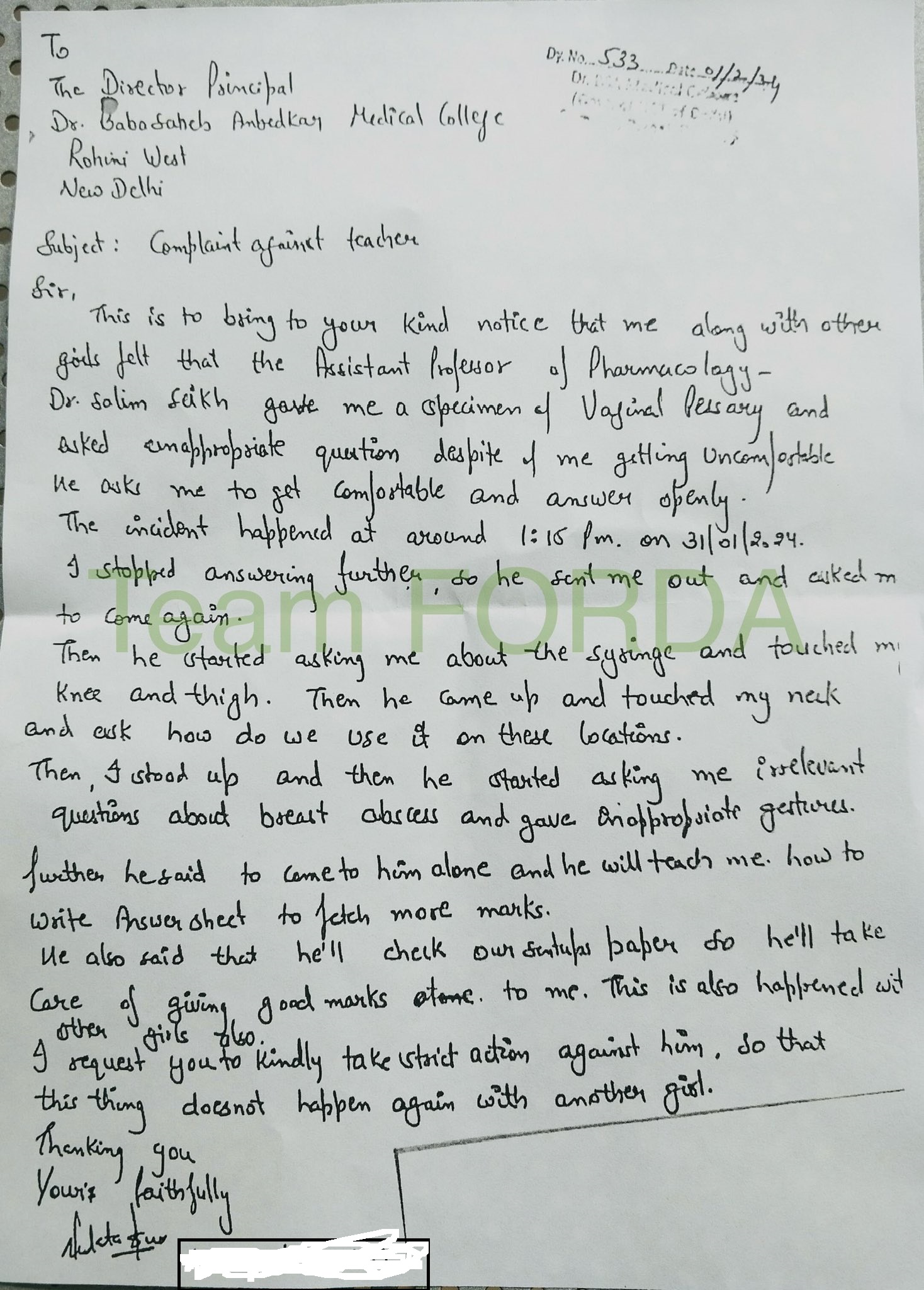 The letter reads: “Me along with other students would like to bring to your kind notice that me along with other girls felt that the Assistant Professor of Pharmacology- Dr. Salim saikh gave me a specimen of Vaginal Pessary and asked me inappropriate questions despite of me getting uncomfortable openly. He asks me to get comfortable and answer. The incident happened at around 1:15 pm. on 31/01/2024. I stopped answering further, so he sent me out and asked me to come again.”