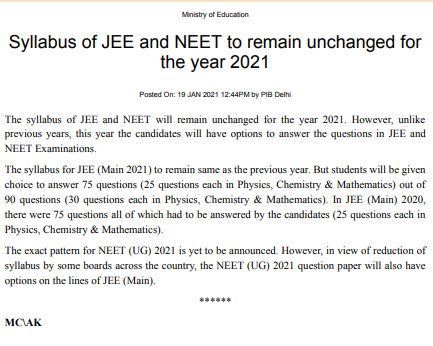 Students can check the official notification given below released by the Education Ministry regarding the NEET 2021 Syllabus stating that it will remain unchanged.