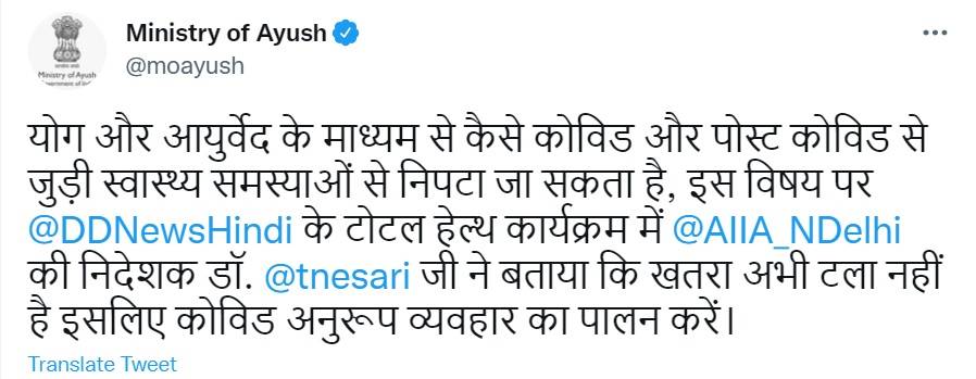 Ministry of Ayush has tweeted today, "The Director of @AIIA_NDelhi Dr @tnesari talks about how yoga and ayurveda can be used to treat Covid and post Covid issues in @DDNewsHindi program Total Health. She says the risk is still not over and everyone must follow Covid appropriate behaviour."