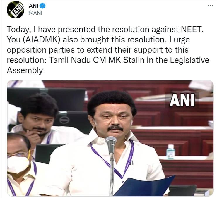 Tamil Nadu CM MK Stalin in the Legislative Assembly said: "Today, I have presented the resolution against NEET. You (AIADMK) also brought this resolution. I urge opposition parties to extend their support to this resolution."