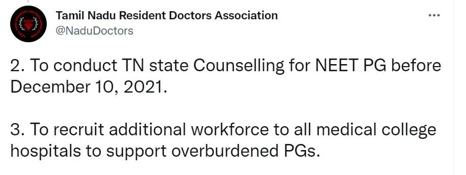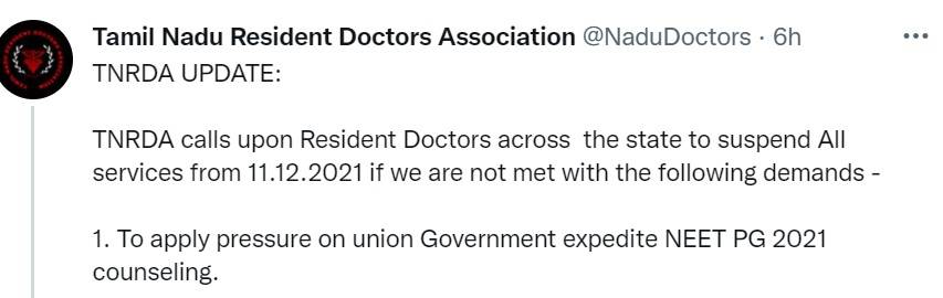 TNRDA has tweeted, "TNRDA calls upon Resident Doctors across the state to suspend All services from 11.12.2021 if we are not met with the following demands -