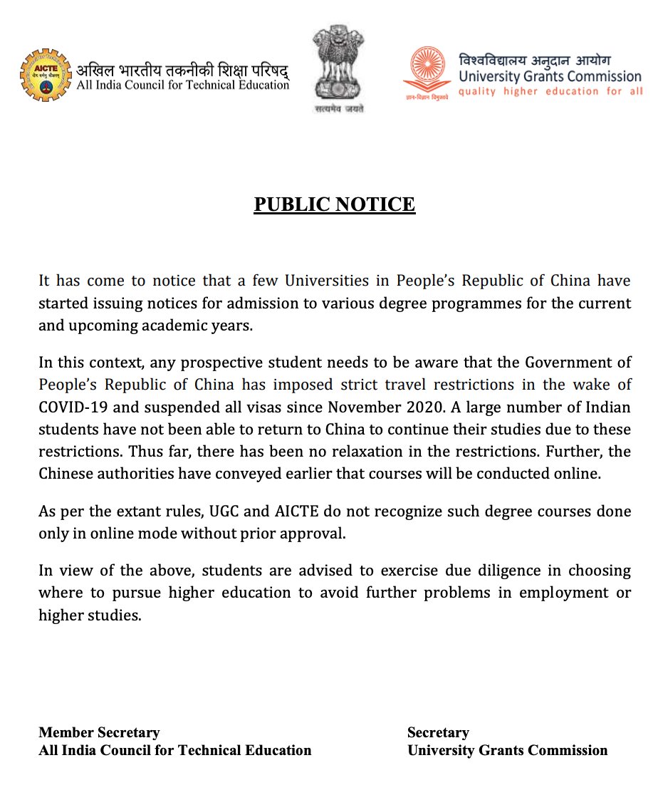 UGC, AICTE joint notice reads: âIt has come to notice that a few Universities in the People's Republic of China have started issuing notices for admission to various degree programmes for the current and upcoming academic years. In this context, any prospective student needs to be aware that the Government of the People's Republic of China has imposed strict travel restrictions in the wake of COVID-19 and suspended all visas since November 2020. A large number of Indian students have not been able to return to China to continue their studies due to these restrictions. Thus far, there has been no relaxation in the restrictions. Further, the Chinese authorities have conveyed earlier that courses will be conducted online.â