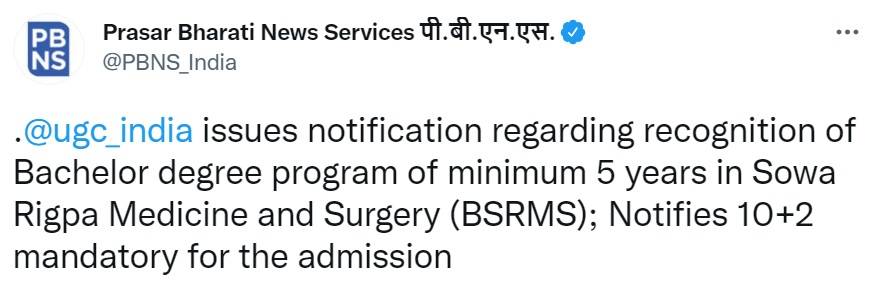 Prasar Bharati tweet reads,"@ugc_india issues notification regarding recognition of Bachelor degree program of minimum 5 years in Sowa Rigpa Medicine and Surgery (BSRMS); Notifies 10+2 mandatory for the admission"