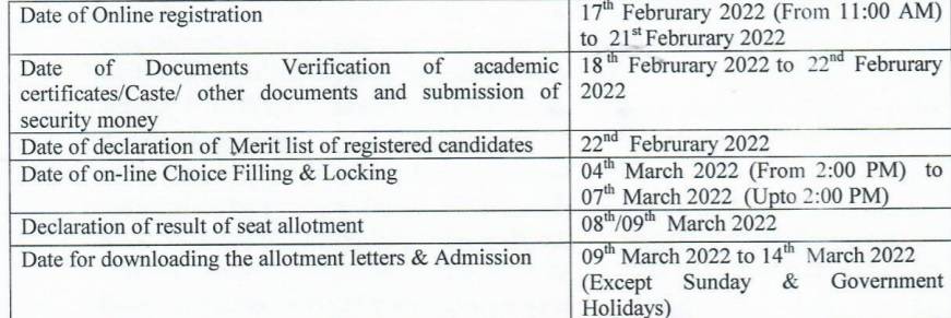 As per the notification, the schedule for documents verification of academic certificates/caste/other documents and submission of security money is between February 18 to February 22. The date of declaration of the merit list of registered candidates is February 22. The schedule for online choice filling and locking is between March 4 to March 7 up to 2 pm.