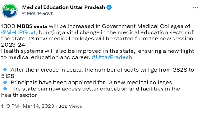 Medical Education Uttar Pradesh tweet reads, "1300 MBBS seats will be increased in Government Medical Colleges of @MeUPGovt, bringing a vital change in the medical education sector of the state. 13 new medical colleges will be started from the new session 2023-24. Health systems will also be improved in the state, ensuring a new flight to medical education and career. #UttarPradesh