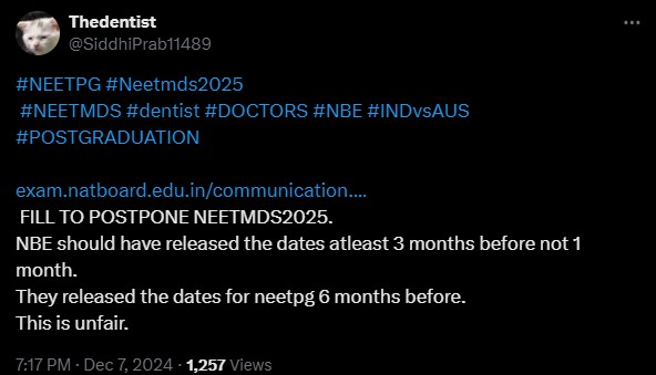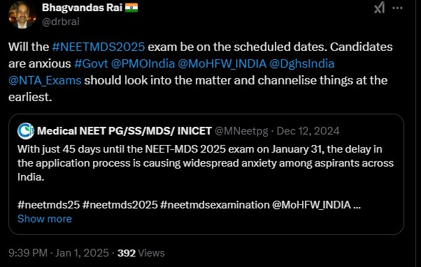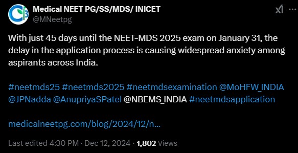 NEET MDS 2025 aspirants have taken to social media platforms like X to seek clarity about the NEET MDS 2025 status. Since NBEMS had just announced the NEET MDS 2025 exam date on November 27, 2024, and no other information since then, has agitated them. Take a look at some of the posts below.
