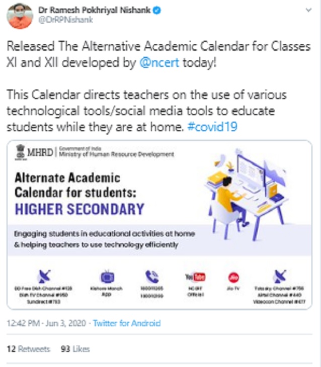 Ministry of Human Resource and Development has announced that the alternative academic calendar for classes 11 and 12 have been released by the National Council of Education Research and Training (NCERT). Union Minister for Human Resource Development Ramesh Pokhriyal 'Nishank' tweeted about the release of the academic calendar.
