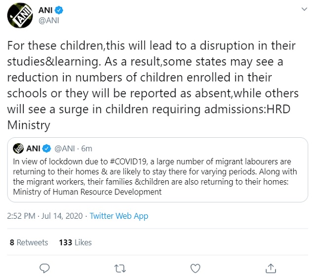 "Such a database may be prepared by each school by personally contacting parents or guardians of all children studying in their school, through phone, WhatsApp, neighbours, or peer groups. Schools should also make note of the tentative place they are staying in during this period. Such children, who have left, may be shown separately in enrolment as temporarily unavailable or migrated. While all care must be taken to ensure that their names are not struck off the rolls (as the possibility of their return anytime is always there), their numbers may be reported class-wise to the Directorate of Education to compensate for any input costs to be incurred by the school such as mid-day meals, distribution of textbooks and uniforms if not already completed," the HRD Ministry said in its guidelines.
