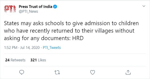 The HRD Ministry also urged the state government that they can also direct all schools to give admission to any child who has recently returned to the village without asking for any documents, except the identity proof.