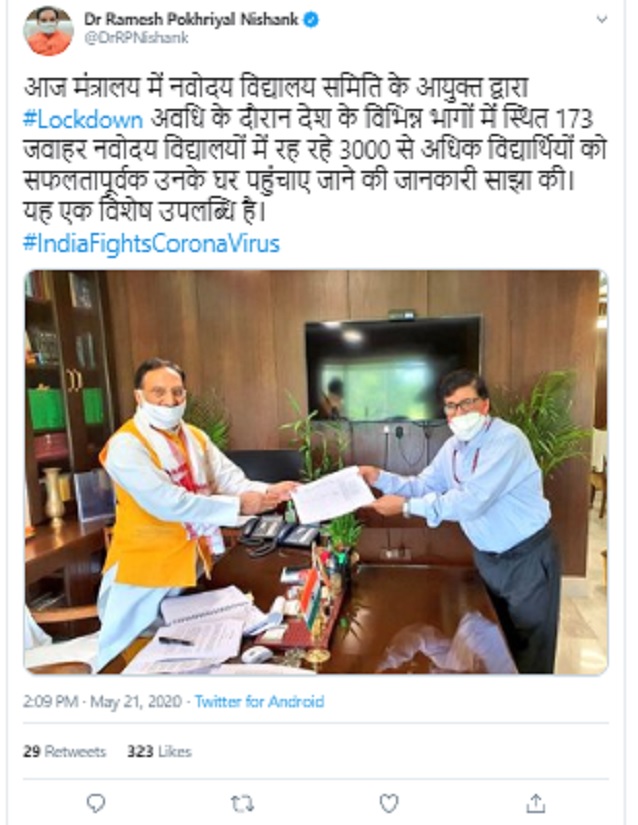 “Today, Jawahar Navodaya Vidyalaya commissioner informed the ministry that more than 3,000 students studying in 173 Jawahar Navodaya Vidyalayas across the country have reached their homes safely during the COVID-19 lockdown,” the Minister tweeted.