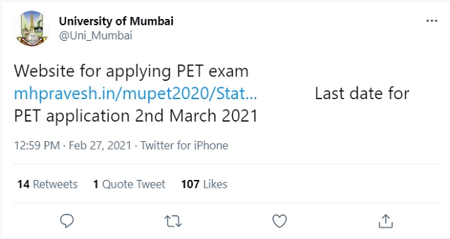 The University of Mumbai PET application dates have been extended by the varsity. Aspiring candidates can now apply for the Mumbai University PET 2021 until midnight of March 2, 2021.