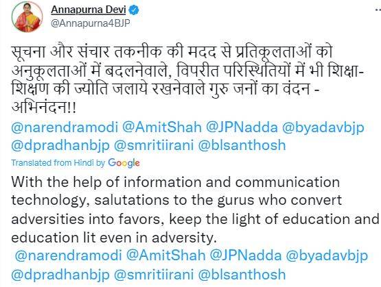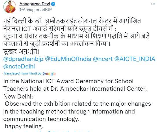 According to the official tweet posted from the Twitter handle of Minister Annapurna Devi, “In the National ICT Award Ceremony for School Teachers held at Dr. Ambedkar International Center, New Delhi: