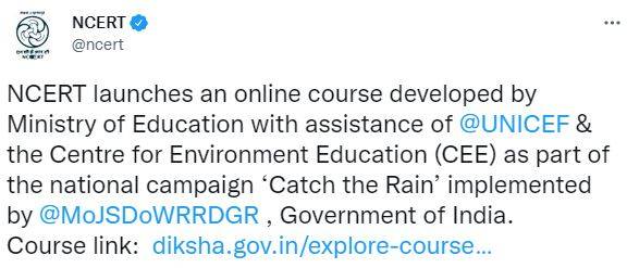In order to inform the interested candidates, the Council through its official Twitter handle wrote, “NCERT launches an online course developed by Ministry of Education with assistance of @UNICEF & the Centre for Environment Education (CEE) as part of the national campaign ‘Catch the Rain’ implemented by @MoJSDoWRRDGR, Government of India.”