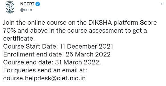 In order to gain a certificate, the enrolled candidates must secure at least 70% score. “Join the online course on the DIKSHA platform Score 70% and above in the course assessment to get a certificate,” NCERT said. For queries related to enrolment, candidates can get in touch with the concerned team by sending an email atcourse.helpdesk@ciet.nic.in