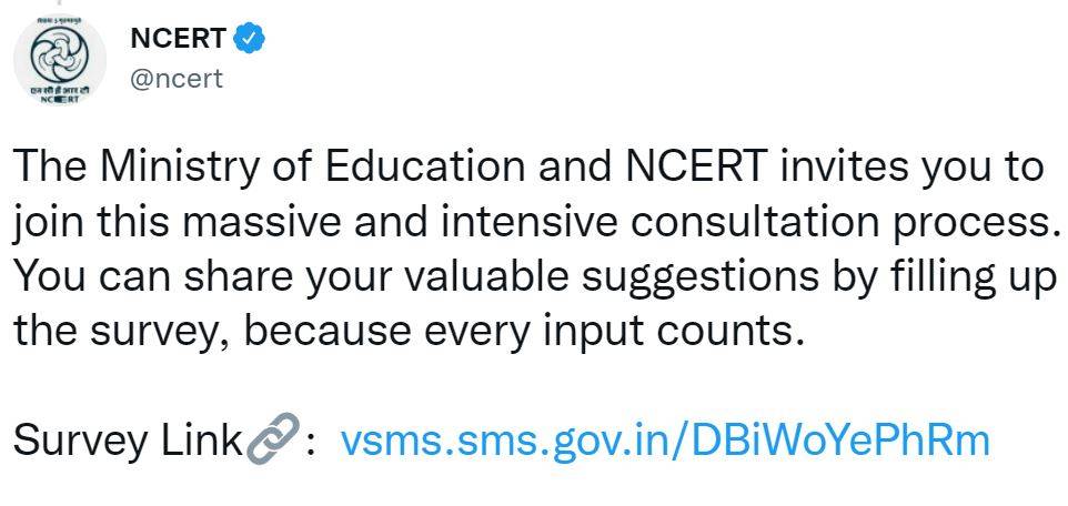 Relating to the ongoing work to revise the National Curriculum Framework (NCF), based on which new school textbooks will be prepared, the Ministry of Education has launched this online public survey to expand the scope of consultations.
