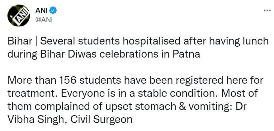 The official tweet reads, “Several students hospitalised after having lunch during Bihar Diwas celebrations in Patna. More than 156 students have been registered here for treatment. Everyone is in a stable condition. Most of them complained of upset stomach & vomiting: Dr Vibha Singh, Civil Surgeon.