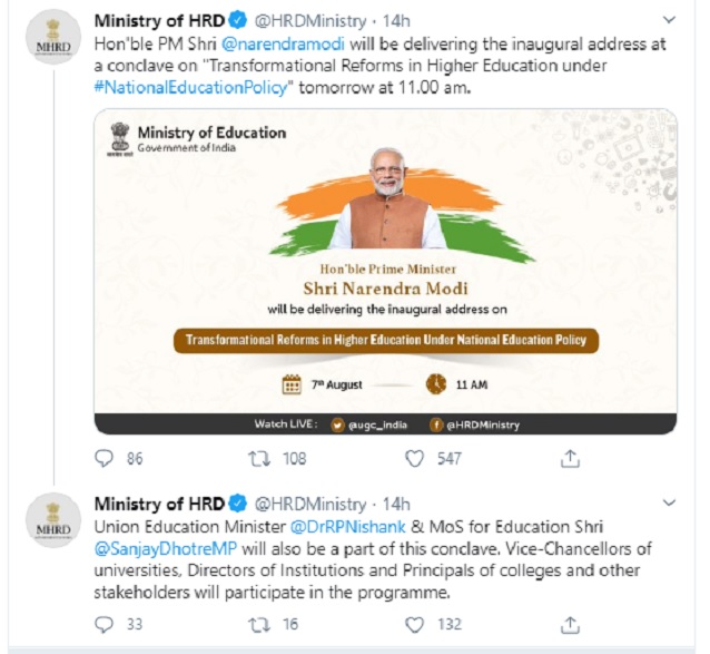 August 7, 11:05 am: Prime Minister Shri Narendra Modi delivers the Inaugural Address at the ‘Conclave on Transformational Reforms in Higher Education under National Education Policy’ through video conference.