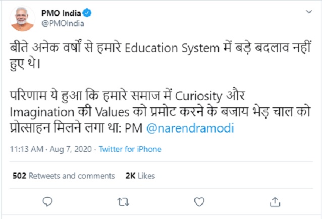 August 7, 11: 20 am: For the last many years there were no major changes in education policy. This new policy will prepare every student to be future-ready and contribute to the nation-building, PM Modi said.
