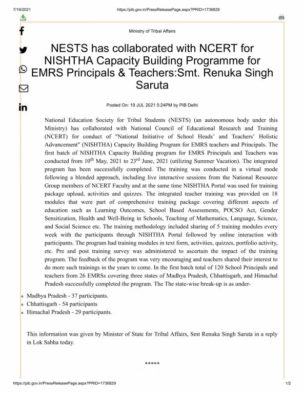 National Education Society for Tribal Students (NESTS) (an autonomous body under this Ministry) has joined hands with the National Council of Educational Research and Training (NCERT). According to the official press release, the collaboration has taken place in order to conduct the "National Initiative of School Heads’ and Teachers’ Holistic Advancement" (NISHTHA) Capacity Building Program for EMRS teachers and Principals.