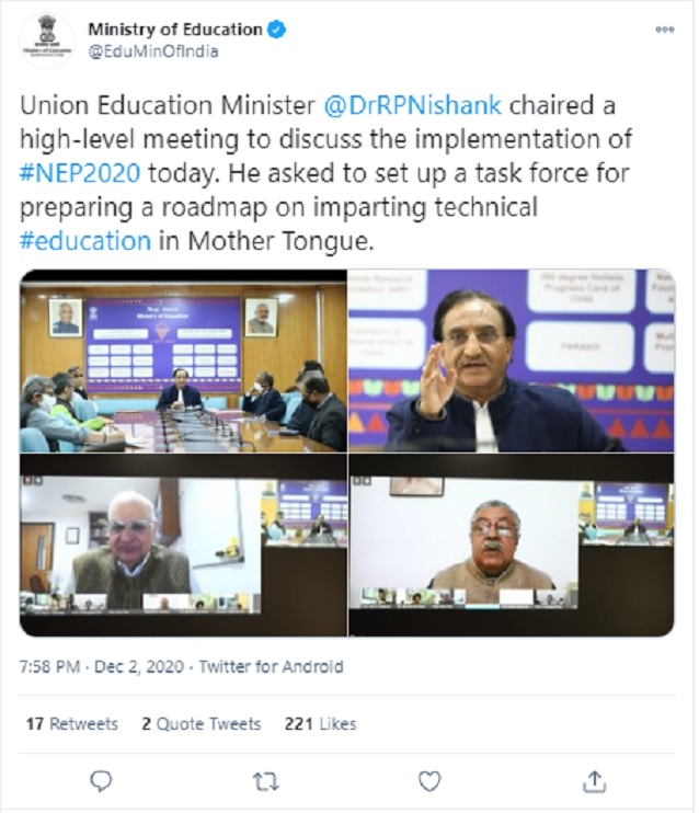 Union Education Minister Ramesh Pokhriyal Nishank chaired a high-level meeting to discuss the roadmap to successfully implement the new National Education Policy (NEP) 2020. In the meeting, the Education Minister also directed the officials to set up a taskforce for imparting technical education in the mother tongue, to promote the mother tongue in the National Education Policy (NEP).