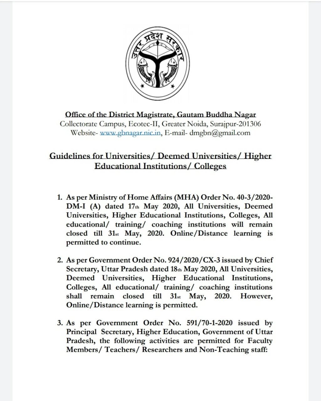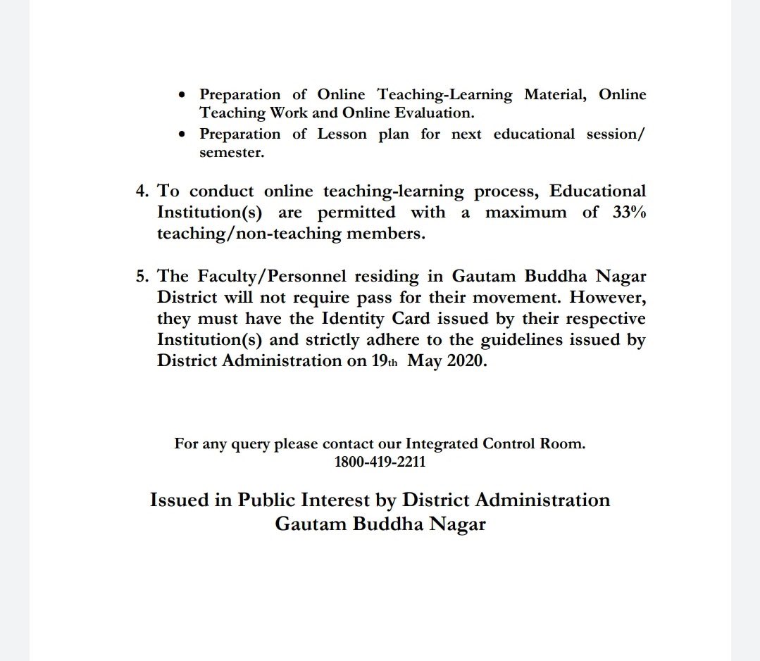 The District Magistrate of Gautam Buddh Nagar released guidelines for Universities and Colleges to enable the teaching-learning process through online mode.