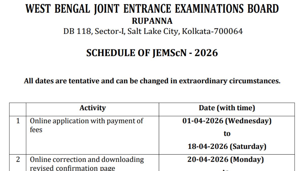 West Bengal Joint Entrance Examinations Board (WBJEEB) has started JEMScN 2026 registration process today i.e. April 1, 2026. Students willing to take admission to Joint Entrance for Master of Science Nursing exam can fill application form in online mode. JEMScN 2026 registration link is active at wbjeeb.nic.in. Students are suggested to not wait for JEMScN 2026 registration last date and apply at earliest to avoid last-minute hustle. Further, it is suggested that students must check eligibility criteria before filling online application form.