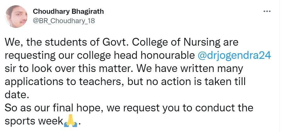 Choudhary Bhagirath, an activist of Akhil Bharatiya Vidyarthi Parishad (ABVP) has tweeted, "We, the students of Govt. College of Nursing is requesting our college head honourable @drjogendra24 sir to look over this matter. We have written many applications to teachers, but no action is taken to date. So as our final hope, we request you to conduct the sports week."